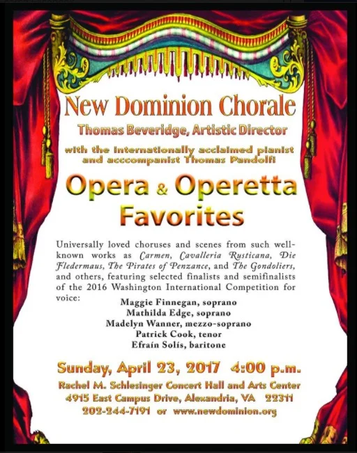 This week I'm in DC making my debut with the New Dominion Chorale and Maestro Tom Beveridge! This program, "Opera and Operetta Favorites," features singers from the 2016 Washington International Competition for Voice, presented by the Friday Morning Music Club. I'm so excited to be singing some really fun repertoire including Poor Wand'ring One from Pirates of Penzance, My Dear Marquis from Die Fledermaus, the Fire Aria from Ravel's L'Enfant et les Sortileges and the Italian Street Song from Naughty Marietta.